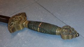 The second sword is a wooden sword made by Raivo Paltser from Estonia. It is designed to be used in semi- to full contact sword sparring and so far it has survived a lot of abuse during many years. To protect it I add another layer of duct tape from time to time, which has increased it’s weight from 700 g to close top 800 g. I should also mention that the sword is designed to behave as close as possible to a real jian, with realistic weight and correct balance. I think it handles very similar to "The Royal Peony" so it is a good design to copy if someone want to make their own sword. Note: The grip has been made a bit longer than what is normal for a jian to increase the weight.