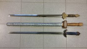 The first sword is the monosteel version of "The Royal Peony" from Huanou. It is a sharp sword and great for test cutting and solo practice. See Sevenstars Trading Co for more information.